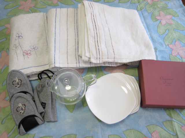 バスタオル3枚、ティーポット、ケーキ皿5枚組み、携帯スリッパ
