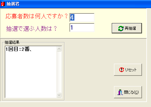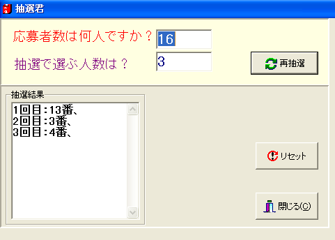 今回は抽選君(フリーソフト)を使って抽選いたしました。