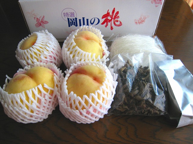 お友達のYさんに岡山の桃ときくらげと春雨とお茶をいただきました。