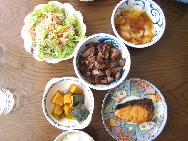 野菜サラダ、鳥レバー、かぼちゃの煮物、ぶりの照り焼き、大根おろし(昨日の残り)