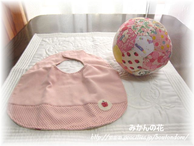 ももたんとのお遊びにって、手作りのベビースタイとボールが入ってました。