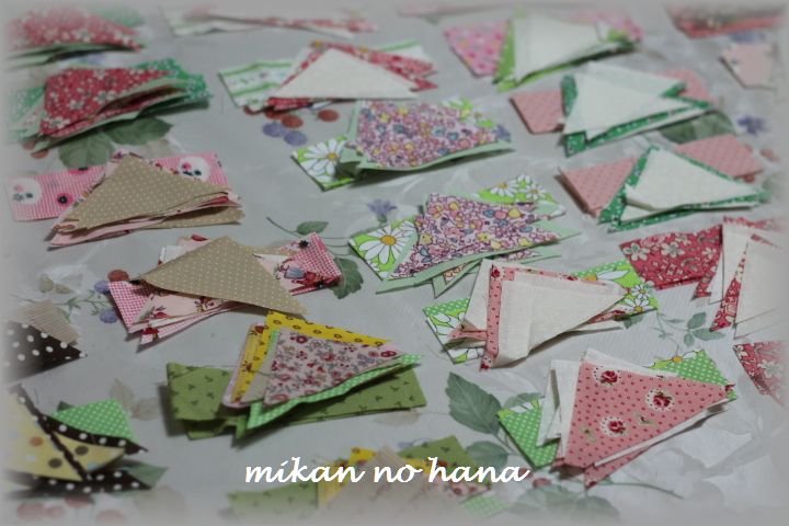 講師科では3つのフライングギースにバーを付けて、1つのパターンとし、16種類の異なった配色で布の配色、配置の勉強をするんです。