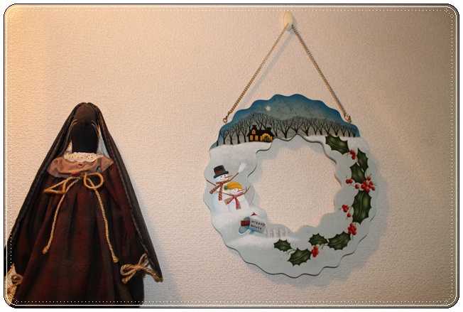 右の壁にあるのは、お友達が作ってくれたトールペイントのリース
